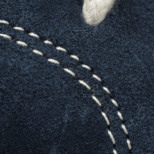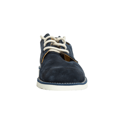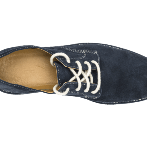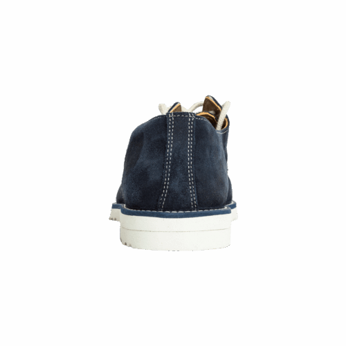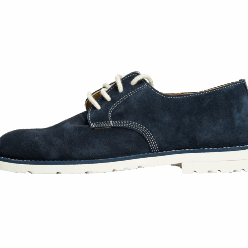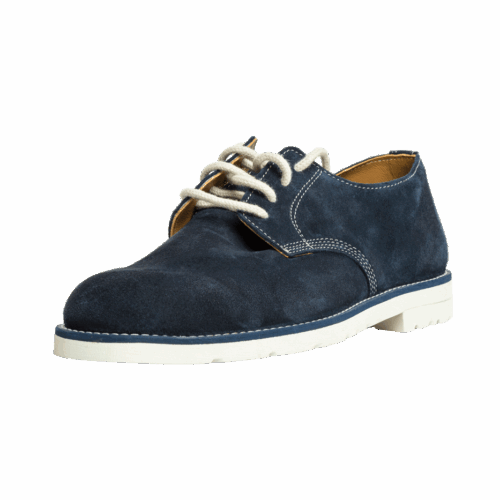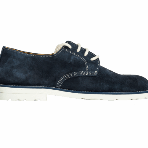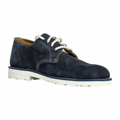 Zapato de cuero natural gamuzado en azul, con suela de caucho blanca. Ideal para el verano. Forrado en piel interior. Lleva incorporada una plantilla en piel acolchada sobre la planta de cuero que permite una mejor transpiración del pie y una mayor comodidad.